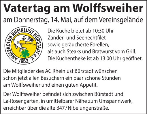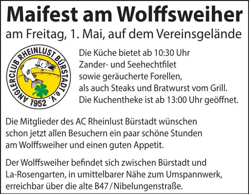 Am 1. Mai veranstaltet der Anglerclub Rheinlust Bürstadt sein traditionelles Maifest am Vereinsgewässer. Für das leibliche Wohl ist mit Speisen und Getränken bestens gesorgt.