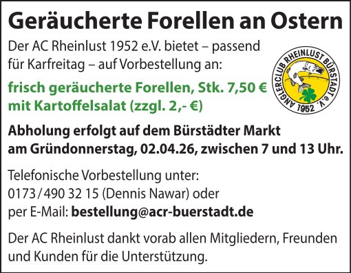 Am Gründonnerstag bieten wir frisch geräucherte Forellen zum Mitnehmen an. Der Verkauf findet traditionell auf dem Bürstädter Wochenmarkt statt. Viele Besucher nutzen diese Gelegenheit, sich für die Osterfeiertage mit frisch zubereiteten Forellen zu versorgen.